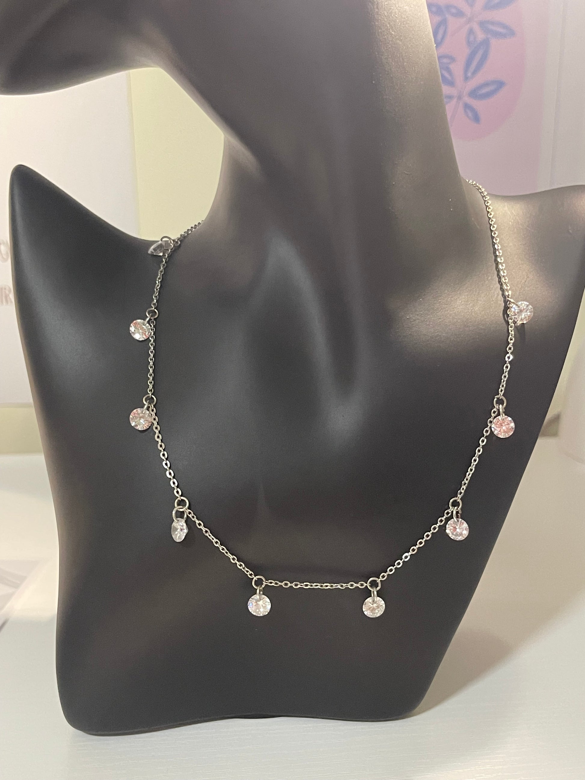 Delicate and refined, this silver-toned station necklace shimmers with crystal-like droplets that catch the light beautifully with every movement. The design offers just the right amount of sparkle — elegant enough for a night out, yet subtle enough for everyday wear.