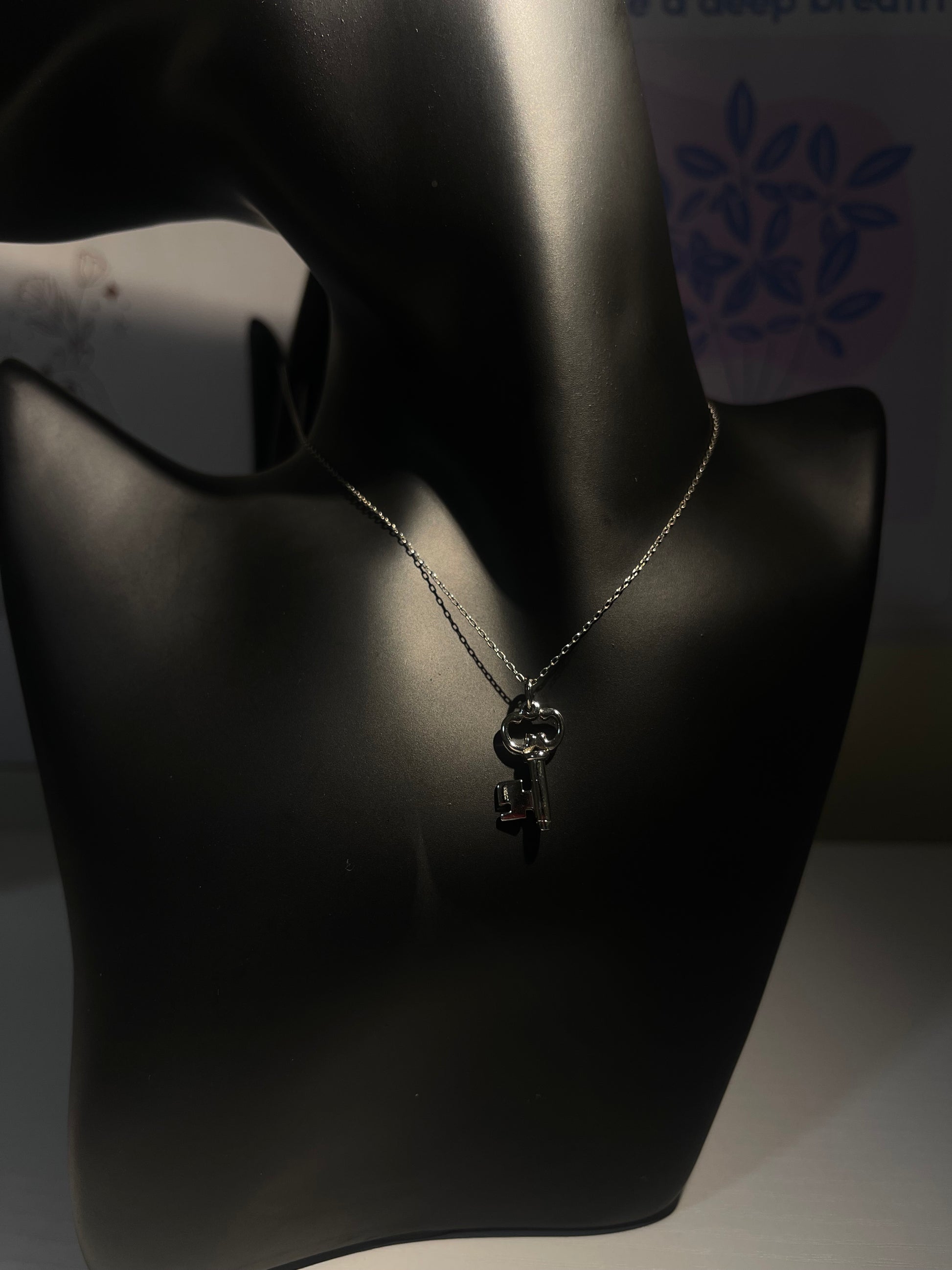 Unlock timeless elegance with this heart-shaped key pendant necklace in sterling silver. The delicate key design features a charming heart detail, symbolizing love and possibilities. This piece adds a touch of sophistication to any outfit. Wear it alone for a minimalist look or layer it with your favorite necklaces for a personalized style statement.