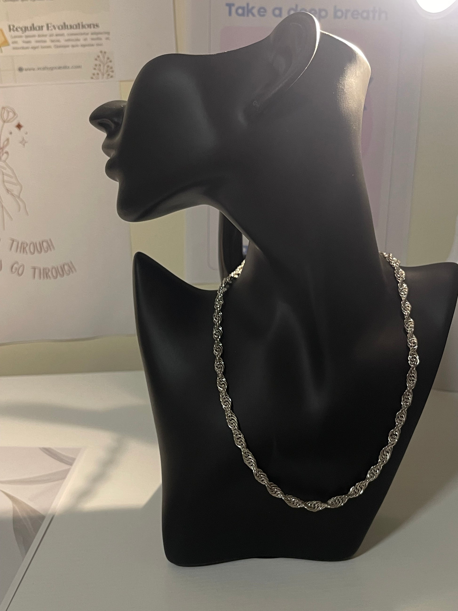 A timeless essential, this sterling silver rope chain necklace embodies elegance in its simplest form. The twisted rope design catches the light beautifully, giving it a subtle shimmer that complements any look — from casual daytime wear to refined evening style.