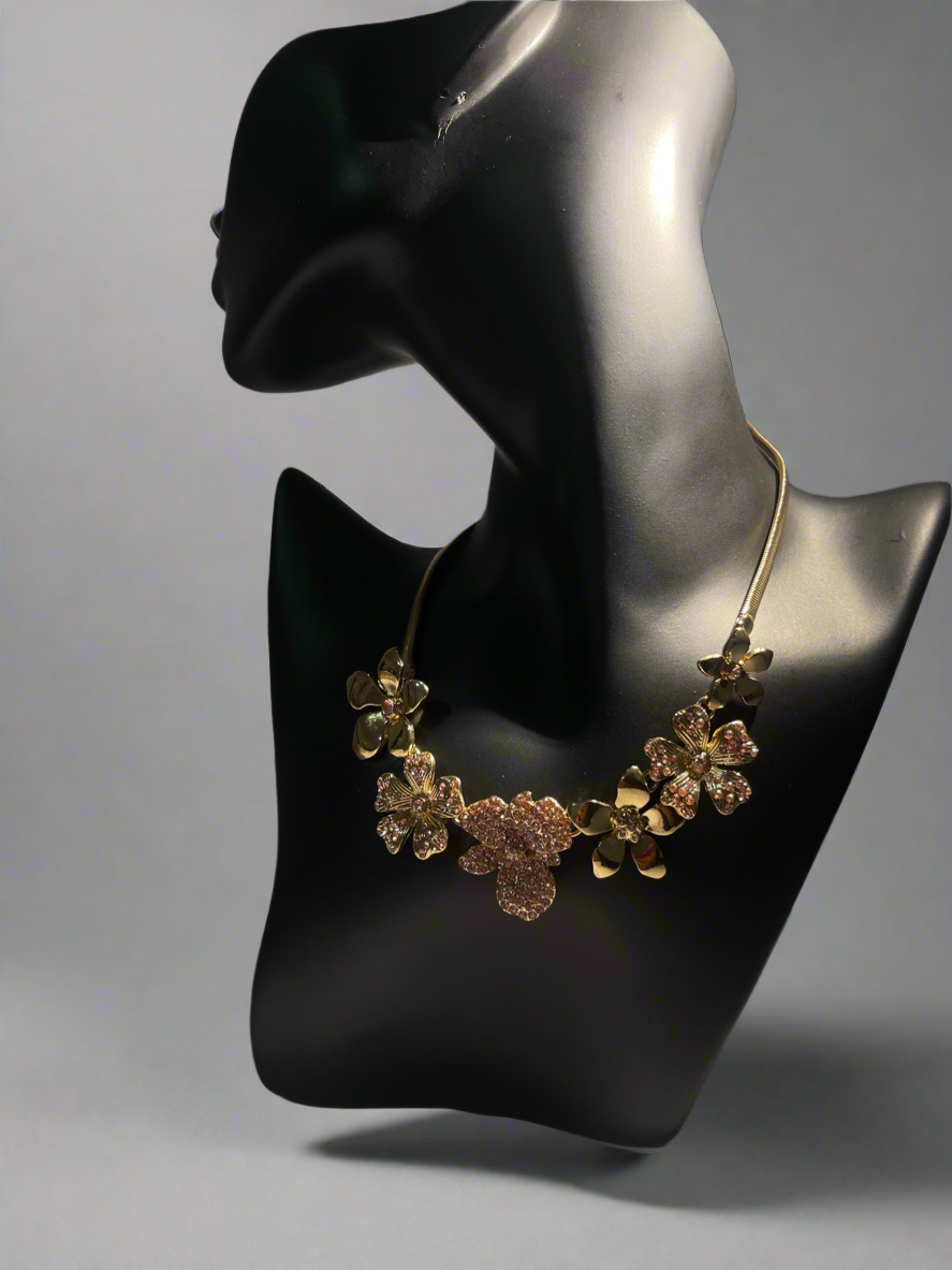 Vintage Gold-Tone Rhinestone Floral Statement Necklace – Elegant Sparkle